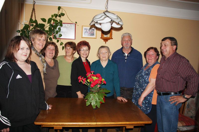 Po izročenih čestitkah in izročenih priložnostnih darilih, smo sedli za bogato obloženo mizo, ki jo pripravili njena hčerka Anica, njen mož Janko in vnukinja Tanja. Ob ponujenih dobrotah, smo najprej nazdravili z radgonsko penino, da je lažje tekla beseda. Kakor običajno smo slavljenki postavljali vprašanja, rezultat tega pa je pričujoči zapis.